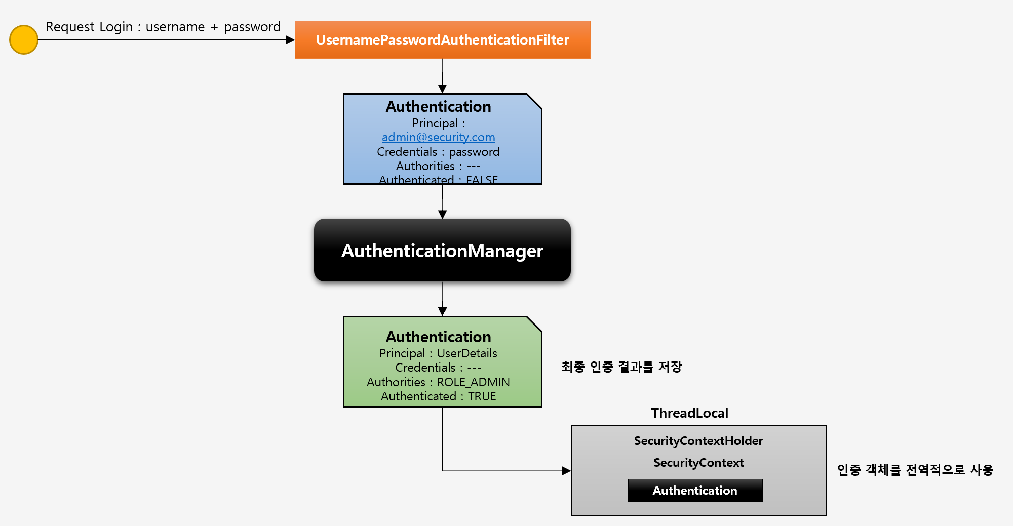 - AuthenticationManager 는 UsernamePasswordAuthenticationFilter에게 인증된 토큰을 넘겨줌.