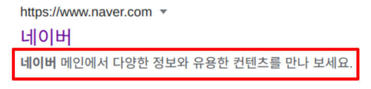 <meta name="description" />태그에 입력한 내용은 구글, 네이버 등 검색엔진에서 사이트 검색시 상세 설명 내용 부분에 표시됨.