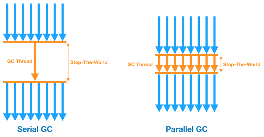Parallel GC은 Serial GC와 달리 여러 개의 쓰레드를 사용하여 Java Heap을 처리하는 방식입니다. GC 수행 시에는 여러 개의 쓰레드가 동시에 Heap 영역을 탐색하면서 쓸모 없는 객체를 제거합니다. 이 방식은 대규모 시스템에서 높은 처리량을 보장할 수 있지만, GC 동작 시 JVM이 일시 정지되므로 서비스 중인 시스템에서는 이슈가 발생할 수 있습니다.