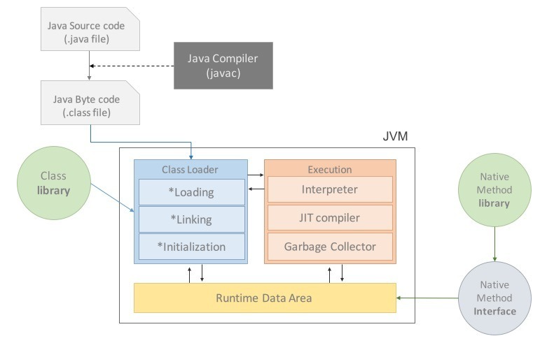 - JIT 컴파일러(Just - In - Time Compiler) : 인터프리터 방식으로 실행에서 야기 되는 성능 문제를 해결하기 위해, 바이트 코드를 네이티브 코드로 변경하고 더 이상 인터프리팅을 하지 하지 않고 실행한다. 네이티브 코드는 캐시에 보관하기 때문에 한 번 컴파일 된 코드는 빠르게 수행하게 된다. 물론 JIT 컴파일러가 컴파일하는 과정은 바이트코드를 인터프리팅하는 것보다 훨씬 오래 걸리므로 단 한번만 실행이 되는 코드라면 컴파일하지 않고 인터프리팅하는 것이 유리하다고 할 수 있다. 따라서 JIT 컴파일러를 사용하는 JVM들은 내부적으로 해당 메서드가 얼마나 자주 수행되는지 체크하고, 일정 정도를 넘을 때에만 컴파일을 수행한다.