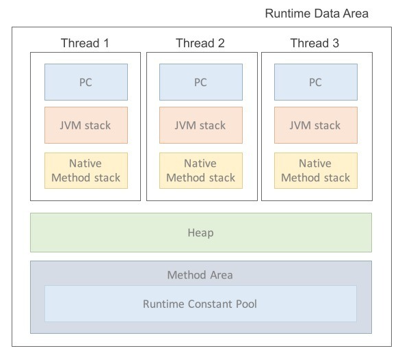 - Method Area 메서드 영역은 클래스 파일을 로드하고 클래스별로 공유되는 정보를 저장하는 영역이다. 클래스 로더가 클래스 파일을 로드하면, 해당 클래스에 대한 정보가 Method Area에 저장된다. 이 정보에는 클래스 변수(static 변수), 메서드 코드, 메서드와 클래스의 Runtime 상수 풀 등이 포함된다. Method Area에 Runtime Constant Pool 이라는 별도의 관리 영역도 존재한다. 이는 상수 자료형을 저장하여 참조하고 중복을 맏는 역할을 수행한다.