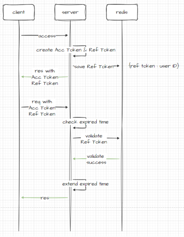 대체로 Access Token의 Expired time은 Refresh Token 대비 매우 짧게 잡고 있습니다. 이러한 이유는 보안과 관련된 문제 때문이겠지요. 위의 SD 에서도 Access Token의 기간이 만료가 되었다고 한들 Refresh Token의 기간이 남아 있기에 가능한 방식입니다.