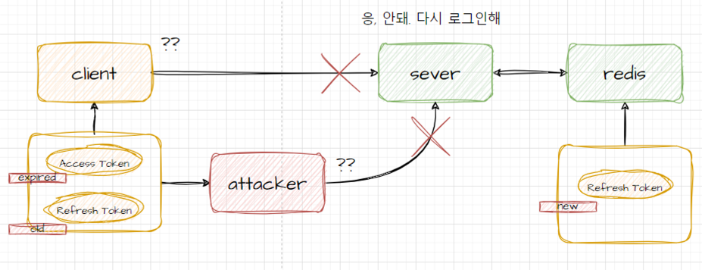 당연하게도 해커는 유저라고 인식이 되어 인증에 성공하게 될 것입니다. 기간이 만료된 토큰도 자연스럽게 새로운 토큰을 얻어 자신이 주인인것 처럼 행동하게 될 것입니다. 참으로 복잡한 상황입니다.