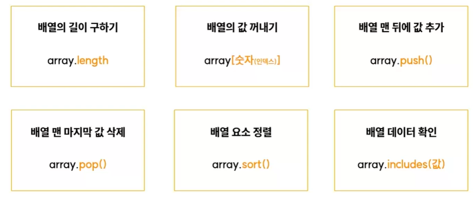 - array.includes(값) : 매개변수로 넣은 값이 배열에 존재 하는지 확인이 가능.