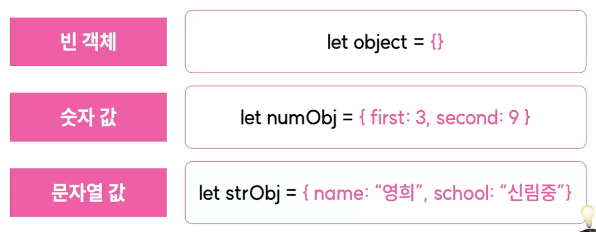 - 객체를 생성할 시 {} 괄호 안에 키 : 값을 입력하여 만들수 있음.
