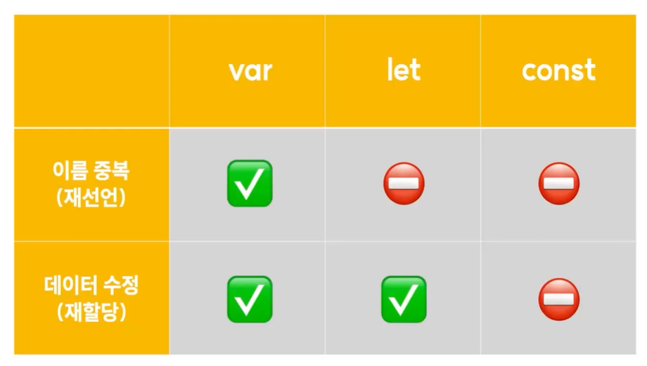- var는 같은 이름의 변수를 선언 할 수 있음(실무에서는 사용하지 않음)
