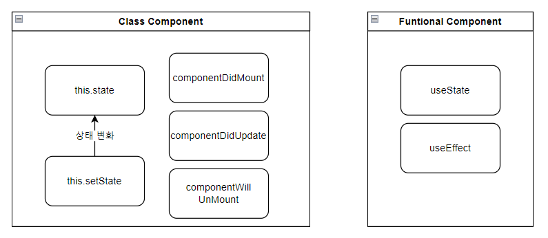 `Class Component` 에서 상태관리 기능은 `this.state` 와 `this.setState` 두 가지로 관리할 수 있었습니다. 하지만 함수형 컴포넌트에서는 사용이 불가한 상황으로 `useState`, `useEffect` 두 가지로 클래스 컴포넌트와 같은 함수들을 사용할 수 있도록 한 것이 `Hook` 입니다.